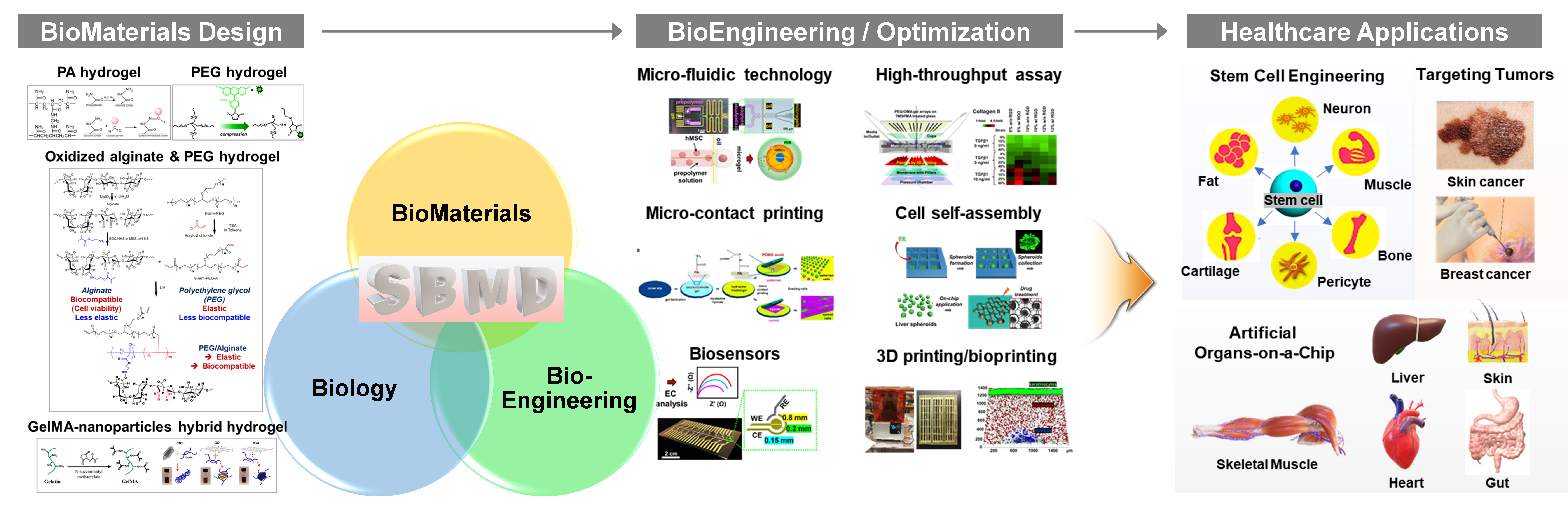 헬스케어공학의 인공장기분야는 생체재료, 바이오공학, 생물학, 의학의 개념을 통합하고 있으며, 살아있는 세포를 사용하여 장기/조직의 정상적인 기능을 유지, 회복 및 증진하는 것을 목표로 하는 융합학문입니다. 하지만, 생체재료-세포 인터페이스에서 조직의 복잡하고 다이나믹한 특성을 모방하는 생체재료 및 기술 개발은 미래 헬스케어산업의 해결해야 할 중요한 과제 중 하나입니다. 또한, 3D 프린팅과 같은 첨단 제조 기술로도 하이드로젤의 복잡하고 다이나믹한 3D 구조를 생성하는 것은 어렵습니다. 스마트 생체재료의 개발과 응용은 3D 프린팅 및 리소그래피로 달성하기 어려운 복잡성과 다이나믹을 가진 3D 세포 친화적인 구조를 생성할 수 있는 잠재력을 가지고 있습니다. 스마트 생체재료에 기반한 시스템을 개발/설계하여 이를 조직공학 및 재생의학에 응용하고, 더 나아가 스마트 헬스케어 엔지니어링을 위한 생체/조직 시스템 및 생체재료-세포 인터페이스를 이해하고자 합니다.